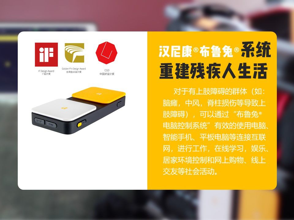 2018中国国际福祉博览会“诶加”创新产品评选活动汉尼康的“布鲁兔电脑控制系统”在本次2018中国国际福祉博览会“诶加”创新产品评选活动中荣获金奖!